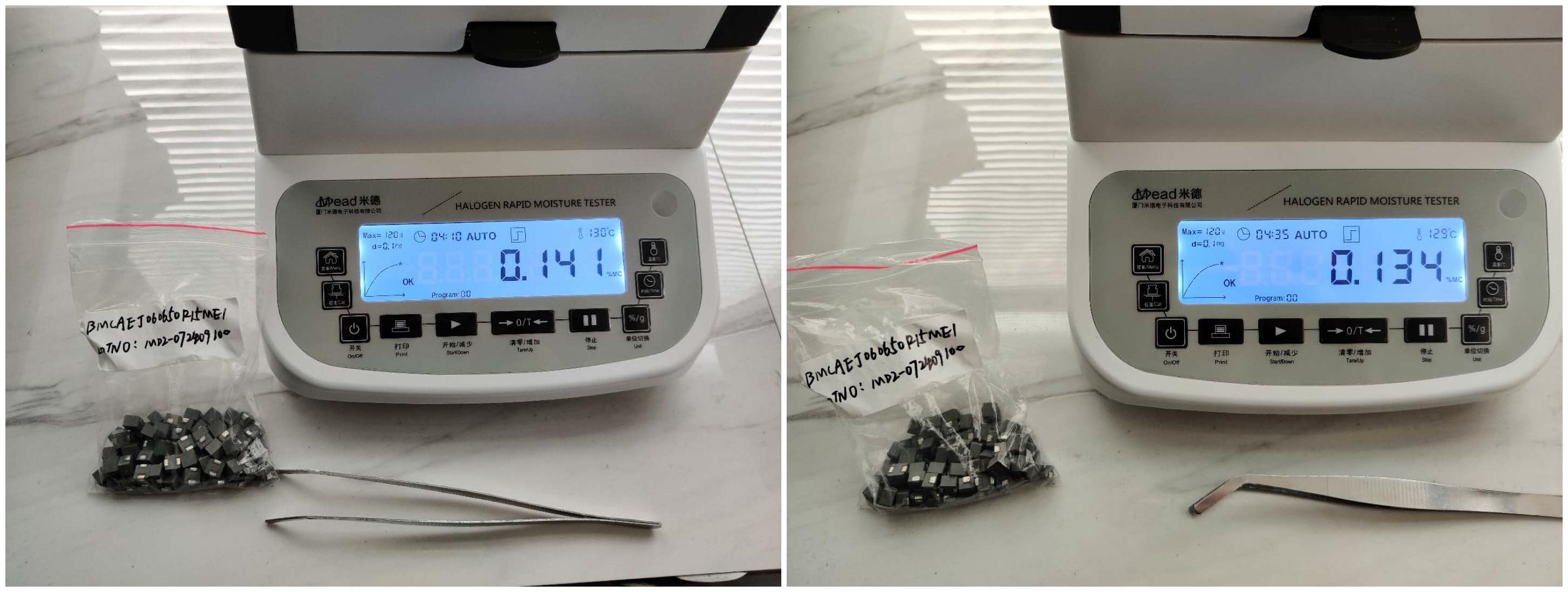 測試目的:在電感的生產(chǎn)過程中,磁芯是不可或缺的一部分,而磁芯是有磁性粉體組成的,在磁芯的生產(chǎn)過程中,從最開始的原理入場,到預燒,到驗收,都需要對水分含量進行檢測,減少水分含量太高對產(chǎn)品功效的影響。