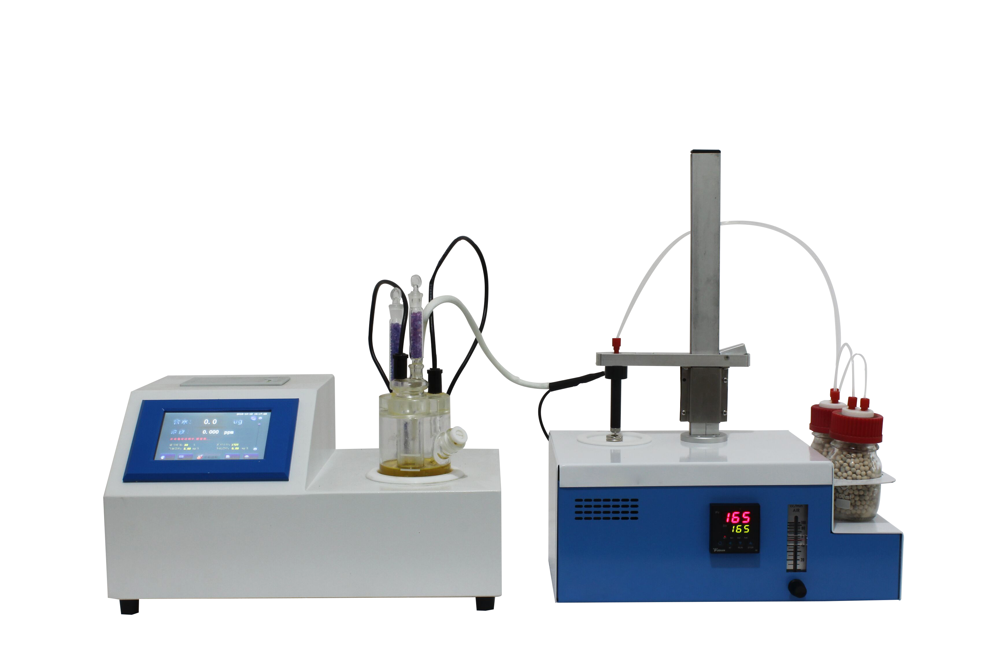 KSQL-310S-KHF 卡氏加熱爐主要分為兩個(gè)部分,第一個(gè)是V-310S庫侖法卡爾費(fèi)休水分測定儀,第二個(gè)是KHF-100卡氏加熱爐,由這兩部分組成了完整的KSQL-310S-KHF 鋰電池材料專用卡氏水分測定儀。