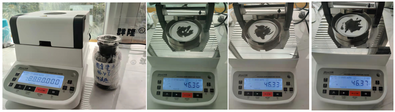 - 復位儀器,待儀器冷卻至40℃以下后,再取等量的漿料均勻涂在玻璃纖維紙上,重復上述測試步驟;測試結束后得出第二組數(shù)據(jù),顯示樣品的固含量為46.33%;第三組數(shù)據(jù),固含量為46.37%;根據(jù)客戶提供的參考數(shù)據(jù)46.30%,實際測試誤差小于客戶給出的誤差±0.5%,表示測試結果可靠,可重復性好。