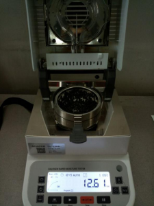 - 為了得到更精確穩(wěn)定的數(shù)據(jù)結(jié)果,在進行第二次測試過程前先等待種子水分儀降溫,待水分儀本身冷卻至40度以下時,同樣取5克種子顆粒于不銹鋼托盤中,將種子顆粒平鋪均勻,這次我們把溫度設(shè)定在135℃,按“START”鍵開始測試,18分54秒后檢測結(jié)束,檢測數(shù)據(jù)顯示12.62%;