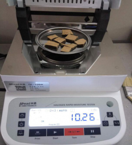 測試樣品:剪取2克紙皮,置于不銹鋼托盤中,將紙皮平鋪均勻,溫度設置120℃用儀器進行加熱,約5分鐘后檢測結(jié)束,檢測數(shù)據(jù)顯示10.26%;