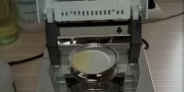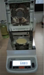 二、儀器本身有個自動降溫過程,為求得數(shù)據(jù)的準確性,故在進行第二次測量的時候先等待幾分鐘,使儀器顯示溫度為40度以下時再進行第二次測量,這次我們加大膠水樣品量為7.025克,將膠水均勻滴于鋁箔盤上,溫度照樣設定在120℃,按“START”鍵開始進行測試,由于這次的膠水量比較多,所以儀器此次用了17分鐘43秒才測試結束,測試結果數(shù)據(jù)顯示31.17%(含水率),按“單位鍵”切換其顯示數(shù)據(jù),則屏幕顯示其固含量為68.83%。