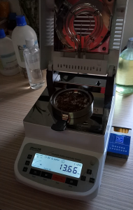 - 為了得到更精確穩(wěn)定的數(shù)據(jù)結(jié)果,在進(jìn)行第二次測試過程前先等待煙絲水分儀降溫,待儀器本身溫度降至40度以下時,同樣取6克煙絲細(xì)條于不銹鋼托盤中,將煙絲細(xì)條平鋪均勻,這次我們把溫度設(shè)定在135℃,按“START”鍵開始測試,2分10秒后檢測結(jié)束,檢測數(shù)據(jù)顯示13.66%;