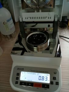 - 為了得到更精確穩(wěn)定的數(shù)據(jù)結(jié)果,在進(jìn)行第二次測(cè)試過程前先等待稀土水分測(cè)試儀降溫,待水分儀本身冷卻至40度以下時(shí),同樣取1克多稀土于不銹鋼托盤中,將稀土平鋪均勻,這次我們把溫度設(shè)定在100℃,按“START”鍵開始測(cè)試,1分35秒后檢測(cè)結(jié)束,檢測(cè)數(shù)據(jù)顯示0.83%;