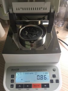 - 測(cè)試稀土:為了使測(cè)試過程中稀土水分測(cè)試儀將稀土烘干烘透,我們將稀土分散開來,以便溫度能滲透進(jìn)稀土內(nèi)部。取1克多稀土撒于不銹鋼托盤中,用勺子將稀土平鋪均勻至鋪滿整個(gè)盤中,為避免稀土高溫烘烤后除水分外的其他物質(zhì)也同樣揮發(fā)掉,我們將溫度設(shè)置在100℃就好,按“START”鍵開始測(cè)試,2分03秒后檢測(cè)結(jié)束,檢測(cè)數(shù)據(jù)顯示0.86%;