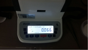 測試樣品3:為了檢測儀器的精確性,待儀器溫度降至30℃(常溫)以下時進行第二次測量,用藥匙取樣10-12g,用藥匙取樣10-12g纖維紙上,溫度設(shè)置85℃用儀器進行加熱,約3分鐘后檢測結(jié)束,檢測數(shù)據(jù)顯示0.067%;
