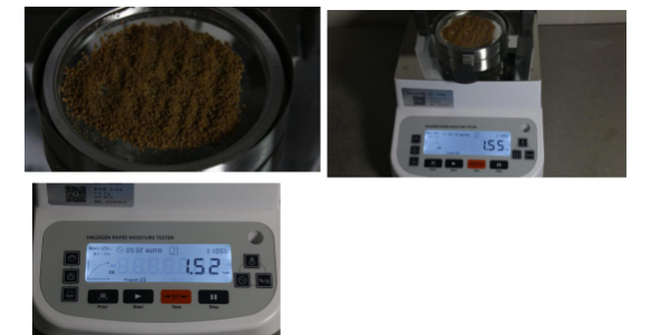 測試樣品1:用實驗勺提取4克藥品,置于不銹鋼托盤中,用實驗勺將藥品平鋪平均,溫度設(shè)置 105℃用儀器進行加熱,約5分鐘后檢測結(jié)束,檢測數(shù)據(jù)顯示1.52%;