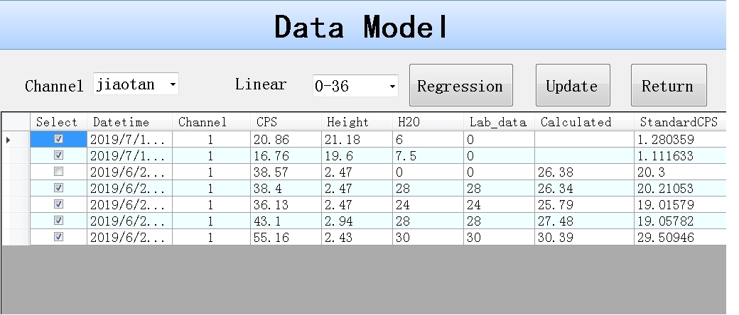 在數(shù)據(jù)列表中select選中的需要參與建立線性的數(shù)據(jù)(在前方框中打勾)。輸入Lab_data數(shù)據(jù)(對(duì)應(yīng)的實(shí)驗(yàn)室化驗(yàn)數(shù)據(jù)),每輸入一次需要點(diǎn)擊Updte按鈕更改一次。然后點(diǎn)擊當(dāng)前頁面 Regression,進(jìn)入下圖:
