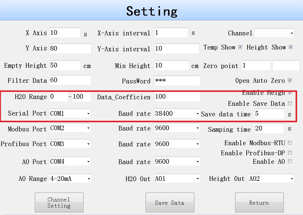 H20 Range:水分值有效區(qū)間,當(dāng)超出此區(qū)間時(shí),只顯示此區(qū)域的最大值或最小值。