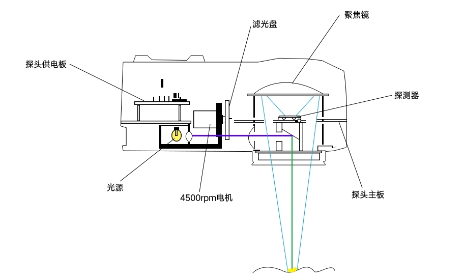 在線紅外水分測量儀使用裝嵌在轉輪上的精密紅外濾光片。這種安裝允許參照光和測量光的脈沖交替地通過濾光片。被保留的光束會被聚焦在受測試的樣品上。首先是參照光被投影在樣品上,然后是測量光被投影在樣品上。這兩個具有時序的光能脈沖會被反射回到一個探測器上,依次轉換成兩個電信號。參考通道表示預計的反射能量的多少。測量通道有一部分被水分子所吸收,因此其能量將出現(xiàn)衰減。這兩個信號結合形成一個比率。這比率與一些從不同含水程度樣品中獲得的其它比率的差,是與兩者含水量的差成正比例。