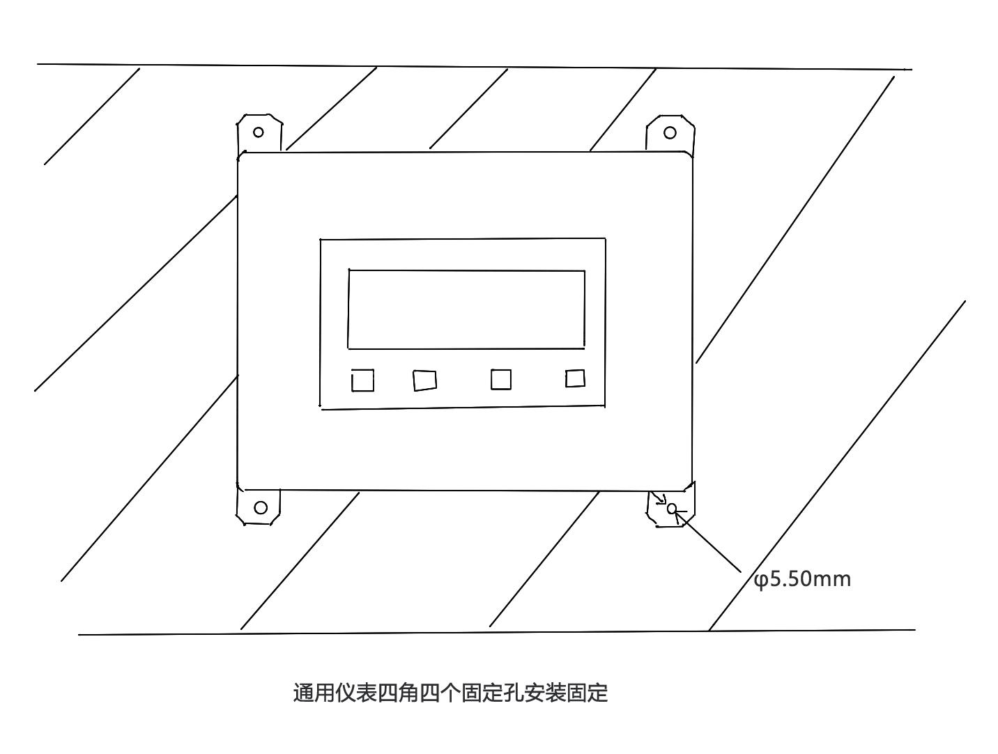 儀表可以通過四角四個固定孔進行安裝固定,安裝在墻面或者生產(chǎn)儀表設備上,例如可以安裝在生產(chǎn)設備槽鋼支架上。